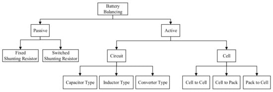 A single lithium battery cell is not sufficient to meet the demand of modern appliances due to the increase in human demand for electricity and the different power specifications required by products. To solve this problem, cells are connected in series to increase the voltage and in parallel to increase the capacity to form a pack to meet the system specifications. It is generally recognized that each battery cell has different features [1,2,3,4], such as capacity, impedance, self-discharge rate, and aging, thereby making voltage imbalance between the battery cells occur when the batteries are in operation. If a battery pack continues to be used in an imbalanced condition, the battery cells will be overcharged/discharged, the battery life will be shortened, and in severe cases, the battery pack will explode [3,4]. Therefore, it is necessary to use a battery balancing circuit in order to allow the battery pack to operate safely for a long period of time. Battery balancing circuits are divided into two groups [5,6,7,8,9,10,11,12,13,14,15], passive balancing and active balancing, as shown in Figure 1.