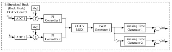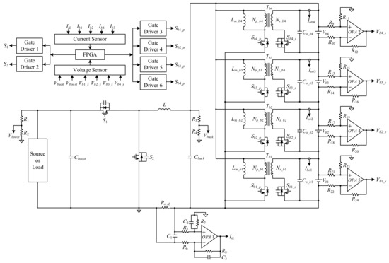 A battery voltage equalizer with a bidirectional buck converter and a flyback converter for charging balance, discharging balance, and static balance is presented herein. The system configuration is shown in Figure 2. A Cyclone III EP3CE144C8N FPGA is used to control the proposed circuit system. This bidirectional buck converter is a battery charger, and its control mode is set to a constant current/constant voltage (CC/CV) to charge the battery during charging. In addition, this circuit has a bidirectional function, so it can discharge the battery and supply power to the load, and its control mode is set to a constant voltage (CV). The primary side of the flyback converter is connected to the low-voltage side of the bidirectional buck converter and the battery pack, and the secondary side of the flyback converter is connected to each corresponding battery cell. A voltage-chasing method, called chain-loop comparison, is proposed for battery voltage equalization. This method involves detection of the voltage of each battery cell and determining whether the corresponding flyback converter is activated or not by comparing each battery cell based on the chain loop. In addition, OPA1 is used as a difference amplifier with filters to sense the voltage across RsiL to obtain the current IiL flowing through the bidirectional buck converter, whereas OPA2 to OPA5 are used as difference amplifiers without any filters to sense the battery voltages Vb1_s, Vb2_s, Vb3_s, and Vb4_s. The voltages Vbuck and Vboost of the bidirectional buck converter are sensed by the voltage divider, and the currents Iob1, Iob2, Iob3, and Iob4 of the secondary-side DC currents of the flyback converters are sensed by the hall current sensors. These sensed voltages mentioned above are sent to the FPGA to generate gate driving signals for the switches.