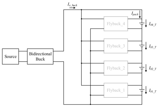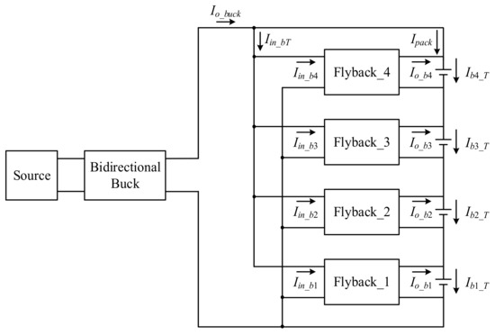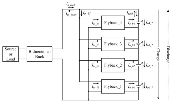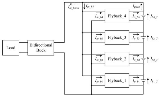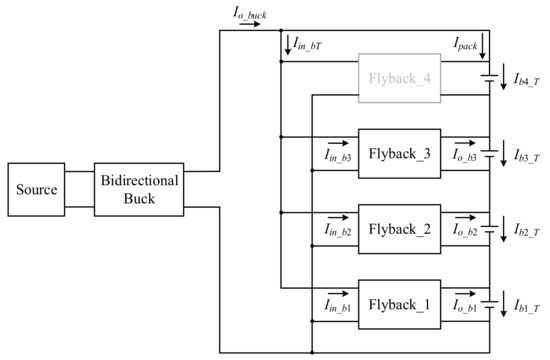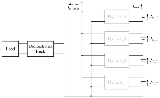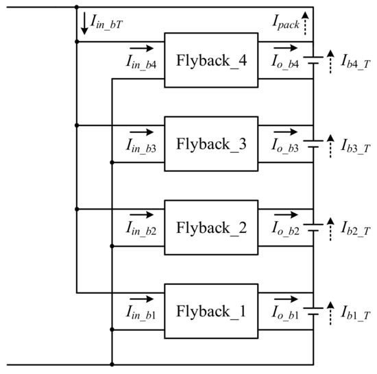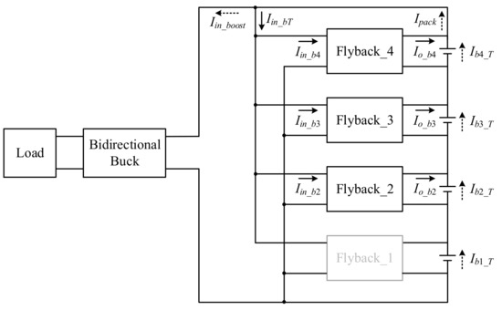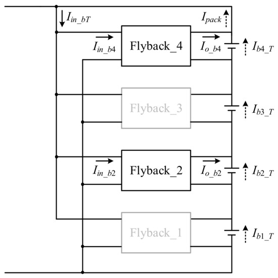 Figure 7 shows the schematic diagram of the discharging balance. In this state, the battery pack has to provide energy to the bidirectional buck converter and provide energy to the flyback converter so that we can determine the final current Ipack through the battery pack as shown in (10). The total input current of the flyback converters, Iin_bT, is shown in (2), and the current flowing through each battery is shown in (11) to (14):