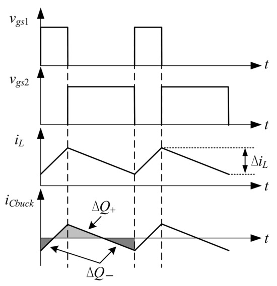 Figure 13 shows the key waveforms for calculating the capacitance in buck mode of the bidirectional buck converter. According to the Ampere-second balance, the average current flowing into the capacitor in one cycle in steady state is zero, so the values of ∆Q+ and |∆Q−| are equal and can be expressed as (23), where ∆Vo_buck is the output voltage ripple in buck mode: