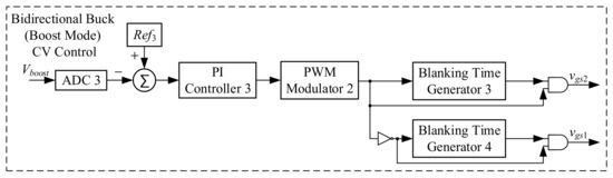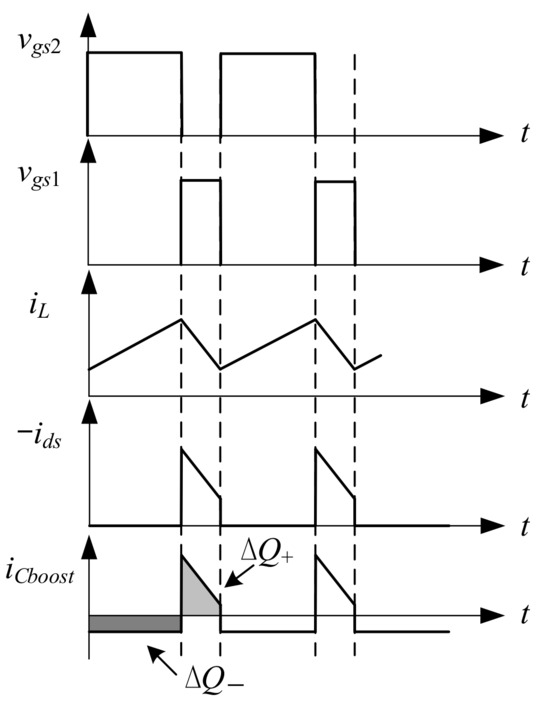 Figure 14 shows the key waveforms for calculating the capacitance in boost mode of the bidirectional buck converter. The average current flowing into the capacitor in one cycle in steady state is zero, so the values of ∆Q+ and |∆Q−| are identical and can be expressed as (27), where ∆Vo_boost is the output voltage ripple in boost mode.