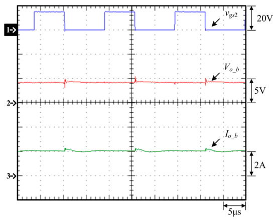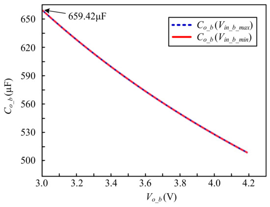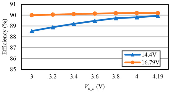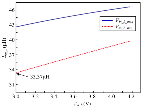 Since the converter is operated in DCM, Equation (37) can be rewritten as (38), and then the value of Dmax in (31), the output current Io_b of 2 A, the turns ratio Np_b/Ns_b of 4, and the maximal and minimal output and input voltages in Table 4 are substituted into the Equation (38) to draw the curves of relationship between Lm_b and Vo_b. This is shown in Figure 15, with the dotted line as the minimum input voltage Vin_b_min for each battery and the solid line as the maximum input voltage Vin_b_max. From this figure, the minimum magnetizing inductance can be found to be 33.37 µH, and the actual magnetizing inductance was chosen to be 29 µH to ensure that the converter can be operated in DCM.