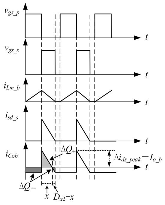 Figure 16 shows the illustrated waveforms of the output capacitor of the flyback converter. Firstly, the related value of x should be calculated, and Equation (39) can be written by using the similar triangle, where Isd_s_peak is the peak current on the switch Sb_p, and ∆isd_s_peak is the peak-to-peak current on the switch Sb_p: