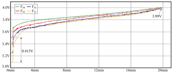 By summarizing the above, it can be seen that Flyback_1, Flyback_2, and Flyback_3 are on, but Flyback_4 is off, as shown in Figure 5, which corresponds to case 15 in Table 1. Equations (2) and (6) can be rewritten as (7) and (8), respectively, while Equations (1) and (3)–(5) remain unchanged. Since three flyback converters are on, the stabilized current source Io_buck provides part of the current to the flyback converter Iin_bT, which reduces battery pack current Ipack, thereby slowing the charge speed of the battery with the highest voltage Vb4. In addition, the batteries with the voltages Vb3, Vb2, and Vb1 are charged by the battery peak current Ipack plus the stable current of 2 A provided by the individual flyback converters, thus increasing the charging speed so that the battery voltage of Vb3, Vb2, and Vb1 can catch up with that of Vb4 to achieve the purpose of charging balance: