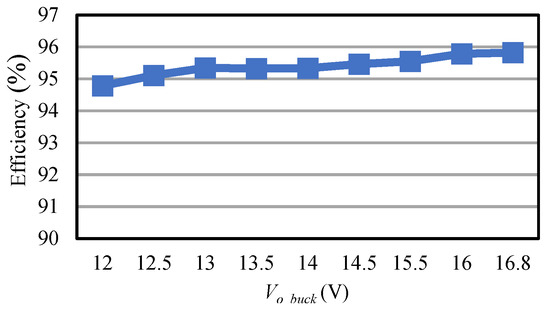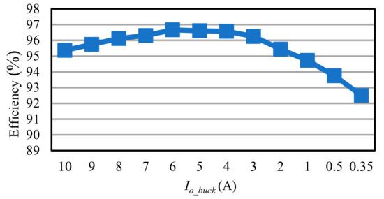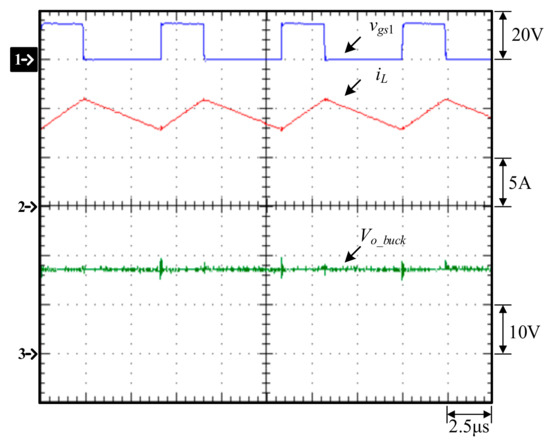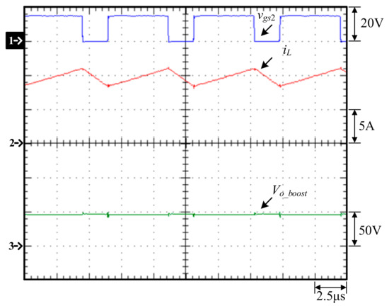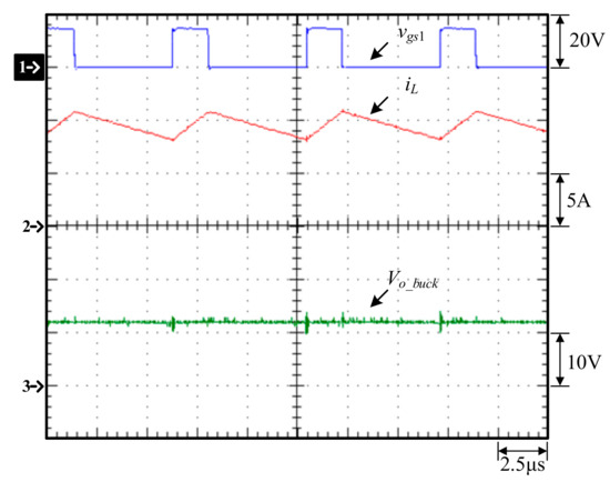 In the design of the inductor, the buck mode was chosen. The boundary output current was set to 2 A. When the output current is lower than this current, the inductor current iL becomes a negative value. The input voltage Vin_buck is 48 V, and the output voltage Vo_buck is 16.8 V, so the corresponding duty cycle Dbuck is 0.35. Therefore, the value of the inductor is 18.2 μH: