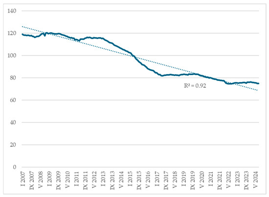 Employment in Polish hard coal mining in 2008–2024 [in thousands]. Source: [https://polskirynekwegla.pl/raport-dynamiczny/stan-zatrudnienia]. [accessed on 1 July 2024].