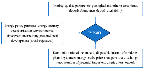 Figure 3 summarizes general considerations on the import of energy resources. It distinguishes three groups of conditions for import decisions. The first group refers to mining conditions, which have a defined character. These conditions are difficult to influence because they are shaped by nature. The second group includes a number of economic factors that must be taken into account when choosing imports. Decision-makers can predict and plan them and attempt to shape them. They therefore have a significant basis for making effective decisions. Additionally, decisions on imports are also influenced by energy policy priorities, which should be clearly and permanently declared.