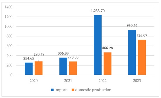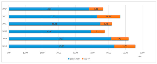 Given mining conditions, Poland should not import hard coal as an energy resource. This is because previous considerations show that it has the resource potential to meet the demand for thermal coal in at least a thirty-year perspective. Until 2018—when permanently unprofitable mines were closed—the growing volume of hard coal imports was explained by the unprofitability of mining and the possibility of acquiring cheaper raw material abroad. It is therefore worth looking at whether and how the situation has changed after the restructuring of Poland’s hard coal mining industry. Figure 4 shows the volume of coal mining in Poland and the volume of imports in 2018–2023.