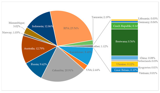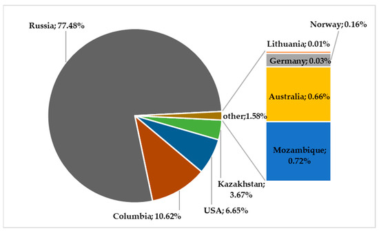 Geographic structure of hard coal imports in Poland in 2020 [in %]. Source: own work based on [83,84,85,86,87,88].
