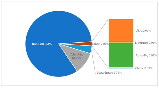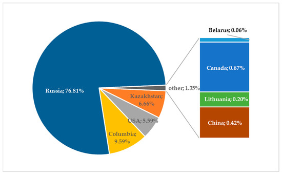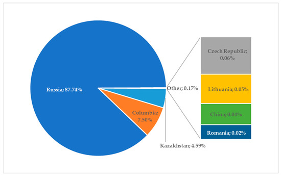 With these observations in mind, it is necessary to take a closer look at the directions of hard coal imports to Poland. This will allow us to assess the scale of dependence on individual suppliers and confirm or deny the thesis that there is no systematized policy for meeting the demand for hard coal, which is the main energy resource in Poland. Thus, Figure 5, Figure 6, Figure 7, Figure 8, Figure 9 and Figure 10 show the structure of hard coal importers to Poland in 2018–2023.