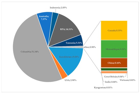 In 2023, the directions of foreign supplies stabilized somewhat. Indeed, imports are already coming from only 14 countries, and their structure shows a heavy reliance on Colombian suppliers. Kazakhstan and South Africa can also be considered significant importers.