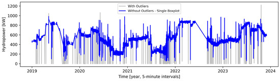 As expected and depicted in Figure 1, after removing outliers, the resulting time series (shown in blue) still exhibited some within-month noise, which needed further attention due to seasonal variations within the data. According to the plant operators, in these types of hydropower systems, such high fluctuations within a single month are unusual and should not occur. Instead, variations should happen more gradually across the year, reflecting the seasonality of the system. Within-month fluctuations should be relatively stable, with no extreme variations. Therefore, to address this issue, the authors explored an alternative outlier detection approach, better suited to time series that exhibit clear seasonal patterns, to reduce the remaining noise and provide a cleaner dataset for forecasting. Indeed, with the boxplot constructed for each month of the year, the percentage of detected outliers increased to 4.02%, identifying outliers both below and above the threshold. Figure 2 compares the time series with outliers to the time series without outliers identified using this method, illustrating the effectiveness of this approach. Notably, after data cleaning, the variation within each month is notably reduced compared to before, reflecting the successful management of outliers.