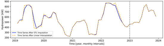 The first method involved replacing missing values after data aggregation. Since the aim of the study was to forecast hydropower for monthly and two-week intervals, the data were initially aggregated using the mean operator (see Section 3.5 for more details on the data aggregation process). Subsequently, any remaining missing values were substituted through linear interpolation.