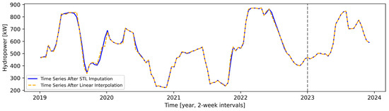 To implement this type of imputation, the ‘STL’ function from the ‘statsmodels’ Python package [43] was utilized. Two parameters were configured: the period and the seasonal. The period, which specifies the periodicity or length of the data cycle, was set to 288. This decision was made because, as explained in Section 3.1, the data exhibited a daily periodicity, and given the 5 min interval data, there are 288 data points in 24 h. Conversely, the seasonal parameter was set to 365, indicating the presence of yearly seasonality in the data (as discussed in Section 3.1).