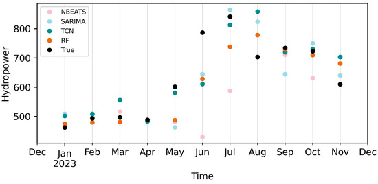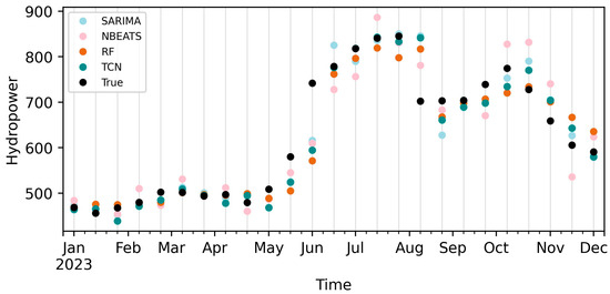 As reported, promising results were obtained with the RF and TCN models. In future studies, the authors plan to use datasets with a greater number of observations in order to compare the models used in this work with other recent time series techniques that require longer historical data, such as LSTM and Transformers. Additionally, by increasing the number of observations, it will be possible to provide long-term forecasts, which are fundamental for evaluating the long-term stability of hydropower generation patterns, identifying potential trends, and optimizing operational strategies for energy production and resource management over extended periods. Furthermore, the authors aim to develop hydropower forecasting models based on external variables, particularly weather-related factors such as rainfall and temperature, to further enhance the accuracy and robustness of the predictions, making the work even more impactful for operational decision-making in the energy sector.