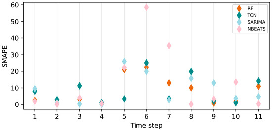 Three different models were tested: RF [44], NBEATS [45], and TCN [46]. Furthermore, the SARIMA [47] model was chosen as the baseline model to check the difference in performance of selected, more complex models compared to this simpler one. A combination of both complex and simple models was chosen to determine which best fit the data, considering the limited size of the dataset. Some models, such as RF and SARIMA, are more tolerant of smaller datasets, while deep learning models like NBEATS and TCN typically require larger datasets to generalize effectively. Nonetheless, all of these models are well suited to handling data with clear seasonal patterns.
