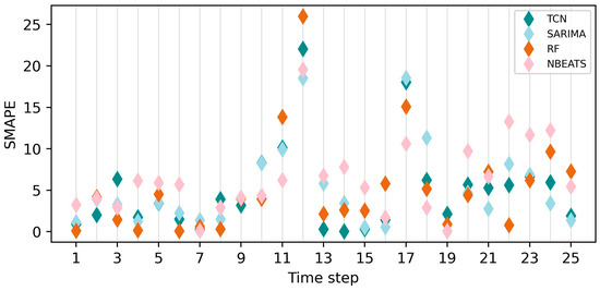 Darts provides two functions to address this requirement: ‘historical_forecasts()’ and ‘backtest()’. The ‘historical_forecasts()’ function generates iterative training sets by either extending from the beginning of the series or maintaining a fixed length (‘train_length’). The model is trained on this set, forecasts a length equal to ‘forecast_horizon’, and then shifts the end of the training set forward by ‘stride’ time steps. The ‘start’ parameter was set to ‘1 January 2023’, indicating the initial date of the test set; the ‘forecast_horizon’ was set to 1 for one-step-ahead forecasting models and 2 for two-step-ahead forecasting models; and the ‘stride’ was set to 1 for one-step-ahead forecasting models and 2 for two-step-ahead forecasting models. With ‘retrain’ set to True, the model updates and retrains with new data after each forecast. Therefore, the validation process involves training the model with the first x observations and testing it with the next x + 1 observation for the one-step-ahead forecasting, and with the next x + 1 and x + 2 observations for the two-step-ahead forecasting. The ‘backtest()’ function directly returns the average error metric after forecasting. The primary evaluation metric used was the Symmetric Mean Absolute Percentage Error (SMAPE). Additional metrics supported the decision-making process, including the Mean Absolute Percentage Error (MAPE), Mean Absolute Scaled Error (MASE), and the Root Mean Squared Scaled Error (RMSSE) [53,54]. Lower values across these metrics indicate better model performance.