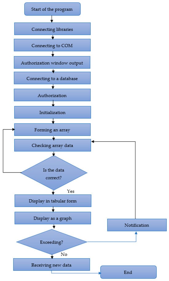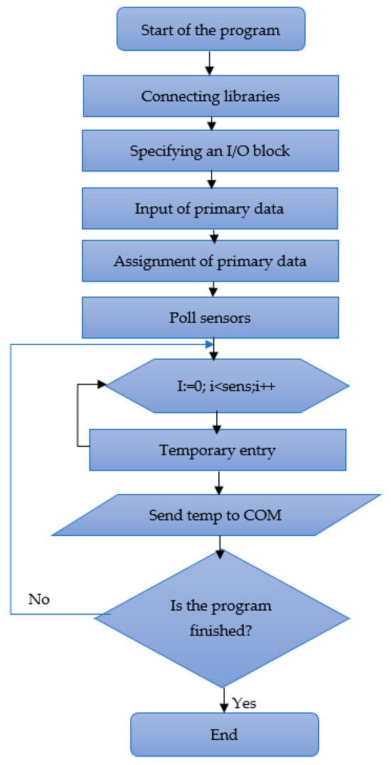 The main stage in the program cycle is the sequential polling of sensors. For this, the addresses recorded in the array and the temperature request function “requestTemp()”, built into the microDS18B20 library, are used. Preparing data before transferring via the COM port is an important stage in the operation of the monitoring system. For the convenience of further processing and minimization of the volume of transmitted information, it was decided to send it as a line with numerical temperature values and special separators.