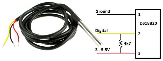 In this work, a digital temperature sensor DS18B20 (San Jose, CA, USA) in a sealed design, shown in Figure 3, is used to implement the system. The pinout of the selected one is shown in Figure 3.