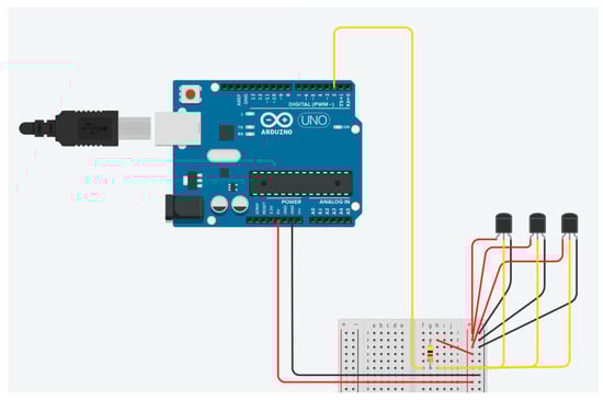 Using the 1-wire protocol when connecting has additional features. In order for one wire to be used for both data transmission and reception, the control signal must be increased. This can be done using a resistor with a nominal resistance of 4.7 kOhm, which must be connected to the data line and the power line. A model of the circuit assembled using the described technology was created using the online modeling service Tinkercad (Figure 5).