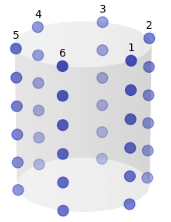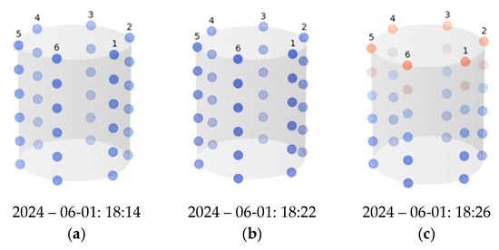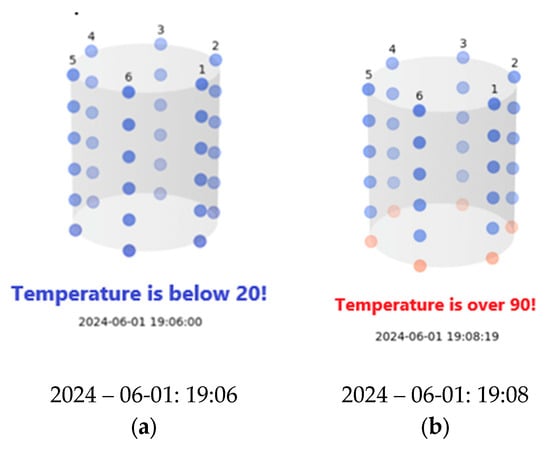 The temperature field is displayed using the functionality of the matplotlib library. In the working window, 36 points are created, corresponding to 36 sensors located on the column. They are given coordinates corresponding to the place of their installation (level and sector of the circle) (Figure 6). To create a temperature gradient, the values of the maximum and minimum allowable temperatures are entered into the program. Using this data, the points on the graph are colored in the appropriate color. The temperature gradient is also displayed in the working window.