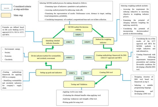 - Step 6 involves creating a methodology framework for a DSS with LCT approach and MFA. This step entails considering utilizations of indicator calculation results obtained by the LCT approach and MFA for MCDM methods to address two key issues: weighting indicators and ranking alternatives. Based on these combinations, the methodology framework is developed, adhering to the following requirements: transparent presentation and the establishment of favorable conditions for developing a flexible DSS tool.