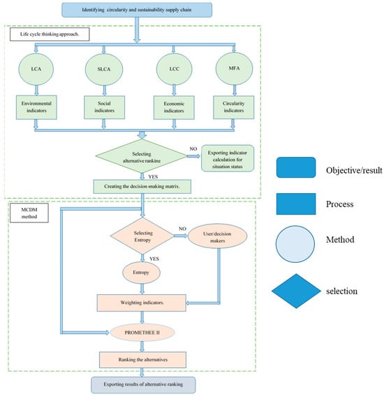 In the proposed methodology framework (Figure 3), the LCT approach has been employed to collect data for determining the indicator values of alternatives. Specially, the LCA approach has been employed to determine environmental impacts for the alternatives of the supply chain, i.e., climate change, particulate matter formulation, human toxicity, land use, and fossil depletion [37,39,48,49,50,51]. The LCC approach has been used to compute economic criteria aspects of alternatives, such as net present value (NPV), total cost, and internal rate of return (IRR) [36,38,39,40,52,53]. The SLCA approach has been used to determine social criteria data for alternatives, i.e., fair salary, job creation, working hours and social investment [28,54,55,56,57,58,59]. Besides that, the Material Flow Analysis (MFA) approach has been employed to calculate the circularity criteria data for alternatives based on the material flows [60,61,62,63]. The results of these approaches can be used for evaluating the circularity and sustainability of a company in the present situation or to create the decision-making matrix that is used in MCDM methods for weighting indicators and ranking alternatives.