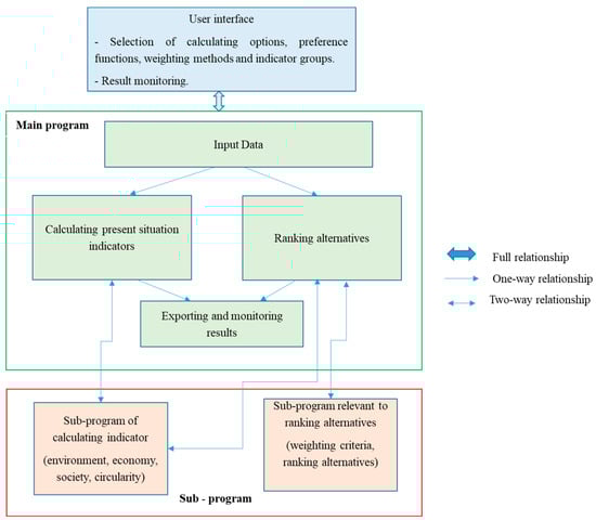 Figure 4 reveals the relationship between components: The User interface directly connects with the Main-program to perform selections and monitor calculation results; the sub-programs link to the Main-program to perform calculations of indicators and ranking alternatives. Sub-programs are categorized into two groups, including sub-programs used to calculate indicators and sub-programs relevant to ranking alternatives. There are two calculation options in the Main-program, including the calculation of indicators for the present situation and ranking alternatives. To calculate sustainability and circularity indicators of the current situation for the supply chain, Main-program uses indicator calculation sub-programs. Meanwhile, indicator calculation and ranking sub-programs are employed by the Main-program to perform the ranking of circularity and sustainability alternatives. In addition, Figure 4 also shows that importing input data and exporting results are performed in the Main-program.