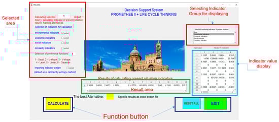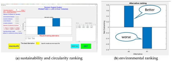 The User interface is designed for selecting calculation options, indicator types, preference function of PROMETHEE II, weighting criteria, and result display. The DSS tool User interface is presented in Figure 5. The left corner of the User interface is used for selection. Specifically, there is a text box to choose the calculation options by typing 0 or 1. If users want to calculate present situation indicators, 1 is typed in this text box. Meanwhile, 0 is typed for ranking alternatives. There are four click boxes to select the sustainability and circularity indicators. The click box is also used to choose the method of weighting indicators. In addition, the text box for selecting the preference function of the PROMETHEE II method is mounted in this corner. This method has six preference function, which are proposed by Brans and Vincke (1985) [77] (usual, V-shape, U-shape, linear, level, and Gaussian function) [66]. These functions are used to aggregate the user preferences on each criterion. The right side of the User interface is used to monitor the indicator calculation results of the supply chain’s current situation or ranking alternatives. The results are displayed in the middle-bottom of the User interface. The best alternative is also shown at the bottom of the User interface. The calculating, reset and exit buttons at the bottom of User interface are used to compute, reset, and exit the program. Additionally, the ranking result is presented in graphical form.