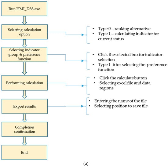 The User interface will appear when the user runs the HMI_DSS tool. The application process of the HMI_DSS tool involves the following processes, as shown in Figure 6a. The selection of data from the Excel-2016 file for calculation is shown in Figure 6b.