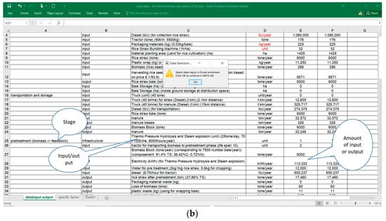 The Main_program is designed to import input data, perform calculations of indicators and ranking alternatives, and export results. For carrying out the calculation options, the input data, including numbers and text formats, is imported from Excel files. The data for indicator calculation includes the supply chain inputs/outputs and the specific impact factors of each indicator corresponding to each input and output (Figure 6b). Additionally, for calculating economic indicators, some general information must be included in the Excel file, such as life span, discount rate, etc. The input data for indicator calculations is organized in four Excel files corresponding to four indicator groups, such as environmental, economic, social, and circular indicators. Each file in Excel contains two main sheets of data: the amount of input or output and specific impact factors of indicators. The imported data are also used to rank alternatives if users use weighting indicators from external sources to present their expectations. The importing of data is carried out in the Main-program according to selection at the User interface. After importing input data, the calculations are carried out by using sub-programs.