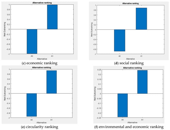 Compared with Torkayesh et al. (2022) [23] and other studies (Section 1), this methodology framework is well-suited for evaluating both sustainability and circularity, providing a higher level of comprehensiveness. The selected MDCM method directly takes advantage of the calculation results of the LCT approach for ranking. Thus, the results of the ranking are objective and reduced dependence on expert judgements. In addition, this framework allows for the selection of different weighting methods (Entropy or decision-maker definition). This helps users to have a more comprehensive assessment when choosing the best alternative because sensitivity analysis is easily performed by changing indicator weighting. This also allows using expert opinions or decision-maker expectations for ranking if it is necessary. Furthermore, this framework also allows not only ranking alternatives but also calculating the indicators of situational status for sustainability and circularity assessment.