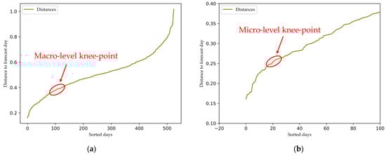 where p and q are the vectors to be compared, and N is their dimension. The calculated distances can then be sorted, and the resulting diagram is shown in Figure 3. Based on this graphical representation, a knee-point can be identified. In Figure 3a, all available similar days are shown to represent the macro-level view. In this broader context, the graph can be analyzed as described in [13] and used to identify the macro-level knee-point at which the graph of distances begins to exhibit a more linear trend. Figure 3b provides a detailed micro-level view of the days most similar to the forecast day, showing the smallest distances. The knee-point at the micro-level can be identified using the same method. For this dataset, the macro-level knee-point typically occurs around the 100th day, while the micro-level knee-point is observed around the 20th day for almost every analyzed day.