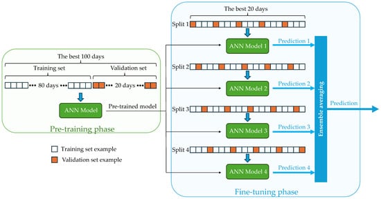 Cross-validation requires splitting the training dataset into k groups (k-fold cross-validation). One group is used as the validation set, and the rest of the data is used as the training set. Training is performed iteratively, and each group is used as a validation set [22,31]. The predictions are averaged to produce a k-fold estimate [25]. In this study, the concept of cross-validation was integrated with ensemble learning to train models on a small dataset during the fine-tuning phase. Each example in this small dataset contains valuable information. However, some examples have to be used as validation examples. By combining cross-validation with ensemble learning, each example is used for training and validation across different folds. The training set was divided into four groups to train the four models. Each model was trained on different training and validation sets. As shown in Figure 5, each model in this fine-tuning phase was started from the same pre-trained model.