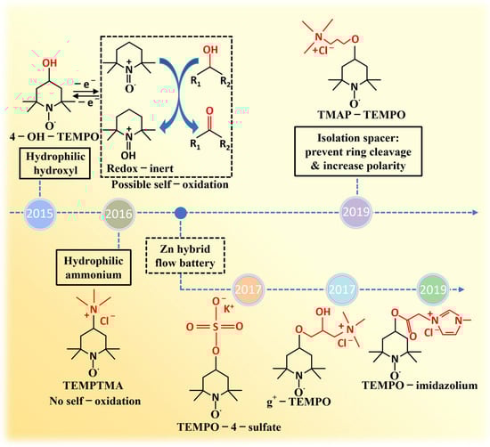 - Liu, Y.; Goulet, M.-A.; Tong, L.; Liu, Y.; Ji, Y.; Wu, L.; Gordon, R.G.; Aziz, M.J.; Yang, Z.; Xu, T. A Long-Lifetime All-Organic Aqueous Flow Battery Utilizing TMAP-TEMPO Radical. Chem 2019, 5, 1861–1870. [Google Scholar] [CrossRef]