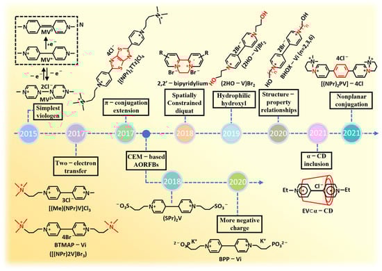 - DeBruler, C.; Hu, B.; Moss, J.; Liu, X.; Luo, J.; Sun, Y.; Liu, T.L. Designer Two-Electron Storage Viologen Anolyte Materials for Neutral Aqueous Organic Redox Flow Batteries. Chem 2017, 3, 961–978. [Google Scholar] [CrossRef]