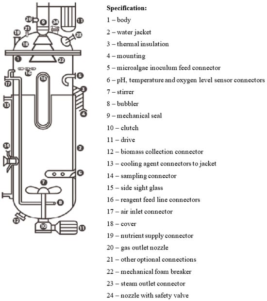 A single cultivation cycle of Schizochytrium sp. lasted 120 h and the initial concentration of waste glycerol in the environment was 150 g/L. During the cultivation cycle, the actual concentration of glycerol in the running bioreactor was monitored cyclically (every 5 h). If the concentration was below 60 g/L, fresh waste glycerol was added in an amount that increased the concentration in the culture medium to 150 g/L. A glycerol concentration below 60 g/L reduced the cultivation efficiency due to the initiation of the stationary growth phase of Schizochytrium sp. [29,30]. The initial culture conditions were as follows: temperature 27 °C, peptone concentration 10 g/L, oxygen mass transfer rate kLa 600 1/h, salinity 17.5 psu, culture pH 6.5, yeast extract concentration 0.4 g/L, turbine speed 740 rpm, air flow rate 3.2 L/h, and initial inoculum concentration 5.0 g dry weight/L [38]. The cultivation of the heterotrophic microalgal biomass was carried out in a bioreactor with an active volume of 20 L (Biostat C, Sartorius Stedim, Aubagne, France). The bioreactor offered all operational possibilities in terms of aeration, mixing, ensuring a constant process temperature, sampling for analyses, media dosing, and pH control. The schematic and layout of the bioreactor are shown in Figure 1.