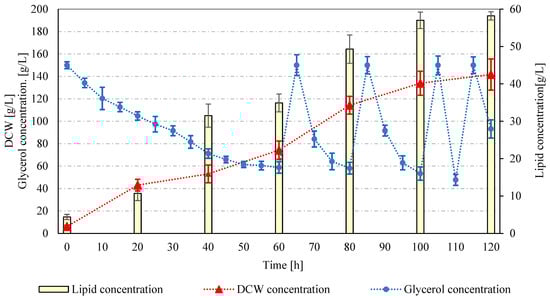 Changes in the concentrations of Schizochytrium sp. DCW, lipids, and glycerol in the bioreactor.