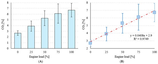 CO2 concentration in the exhaust gas (A) and observed correlation between the applied engine load and CO2 emissions (B).