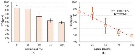 CO concentration in the exhaust gas (A) and observed correlation between the applied engine load and CO emissions (B).