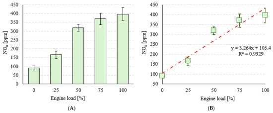 NOx concentration in the exhaust gas (A) and observed correlation between the applied engine load and NOx emissions (B).