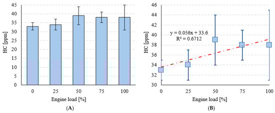 The HC emissions increased significantly from 33 ± 2 ppm to 39 ± 5 ppm in the range of the tested EL from 0% (V1) to 50% (V3) (Figure 6). In the next tested experimental variants, namely V4 (EL75%) and V5 (EL100%), the HC concentration in the emitted gases remained at a constant level of 38 ± 3 ppm and 38 ± 7 ppm (Figure 6). No close correlation was found between the increase in HC emissions in the exhaust gas and the engine load. The coefficient of determination in this case was R2 = 0.6712 (Figure 6). Significantly lower HC emissions were observed when the drive unit was operated only with biodiesel produced on the basis of rapeseed oil [97]. In this case, the HC concentration in the exhaust gas was between 27 ± 2 ppm and 35 ± 6 ppm, depending on the engine load tested (Table 5). With diesel fuel, the values ranged from 40 ± 4 ppm to 46 ± 6 ppm [97].