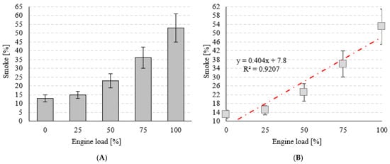 Smoke opacity of the exhaust gas (A) and observed correlation between the applied engine load and smoke opacity (B).