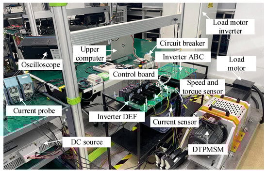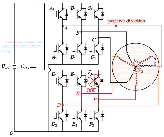 The schematic of a typical DTPMSM driver is illustrated in Figure 1. The DTPMSM consists of two sets of three-phase windings, denoted as phase ABC and phase DEF, respectively. The neutral points of the two sets of windings are isolated to eliminate the zero-sequence currents, and there is a phase shift of π/6 between the phase ABC and phase DEF windings. The inverter comprises two sets of three-phase two-level inverters in parallel, corresponding to the two sets of three-phase windings.