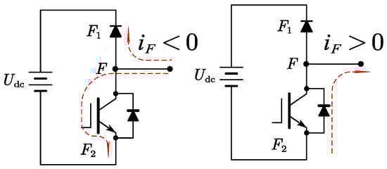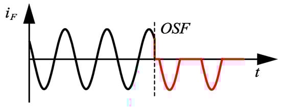 A single OSF is a common fault in power devices. In this case, the switch is open while the freewheeling continues to operate normally. To clarify the impacts of OSFs on the inverter operation, the open-switch fault in the upper leg switch of phase F is taken as an example. In the VSD model, the normal operation of the remaining five phases will be affected by the single OSF. The schematic diagram is shown in Figure 1 when OSFs occur. Figure 2 illustrates two types of current paths when the polarity of the phase current changes under OSFs. It is evident that the current paths remain the same as in normal operation, flowing through the upper freewheeling diode and the lower IGBT when iF < 0. When iF > 0, there is only one path for the phase current, flowing through the lower freewheeling diode. Figure 3 depicts the phase current waveforms when OSFs occur during a positive current period. The phase current area that is approximately zero and negative is evenly divided. When the phase current is approximately equal to zero, OSFs are equivalent to OPFs, thereby affecting the normal SVPWM strategy of the DEF three-phase winding. Therefore, OSFs can be regarded as a combination of OPFs and normal operation.