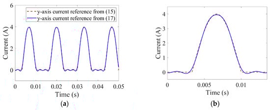 Comparison of y-axis current reference calculated by (15) and (17). (a) Overall view. (b) Zoomed-in view of one cycle.