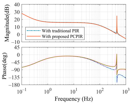 The open-loop Bode diagram of the current loop with traditional PIR and proposed PCPIR.