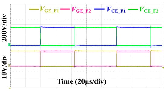 To validate the effectiveness of the proposed method, a dual three-phase experimental platform has been constructed, as depicted in Figure 8. The DTPMSM is powered by two parallel three-phase two-level voltage inverters. PWM signals are generated by a control algorithm implemented on the DSP28335 processor from Texas Instruments, Dallas, TX, USA. The current loop execution frequency is configured to 10 kHz, matching the PWM frequency. The dead time is set to 500 ns. Two independent SVPWM modulation strategies are used to generate PWM signals. The three-phase asynchronous motor is controlled by the inverter to vary the load torque. The speed and torque sensor outputs pulse signals. Figure 9 presents waveforms of the gate drive and voltage between the collector and emitter of the IGBT under normal operation. The parameters of DTPMSM are detailed in Table 2.