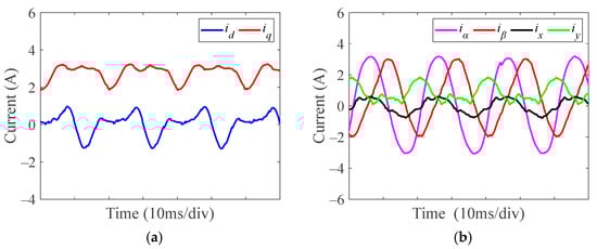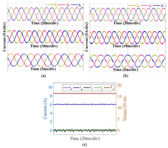 Due to experimental constraints, the simultaneous measurement of all six phase currents is not feasible; hence, phase currents of both sets of three-phase windings are shown separately in Figure 10a,b. The current waveforms for both sets of windings under the same control strategy are nearly identical, indicating their symmetry. Figure 10c displays the waveforms of the dq-axis currents, xy-axis currents, and torque at 1500 r/min under rated load, obtained from the upper computer. As observed in Figure 10c, there are minimal fluctuations in the dq-axis currents, xy-axis currents, and torque, indicating effective suppression of the fifth and seventh harmonic components in phase currents by PCPIR controllers in the xy subspace. The motor exhibits good performance under rated operating conditions.
