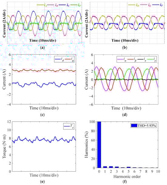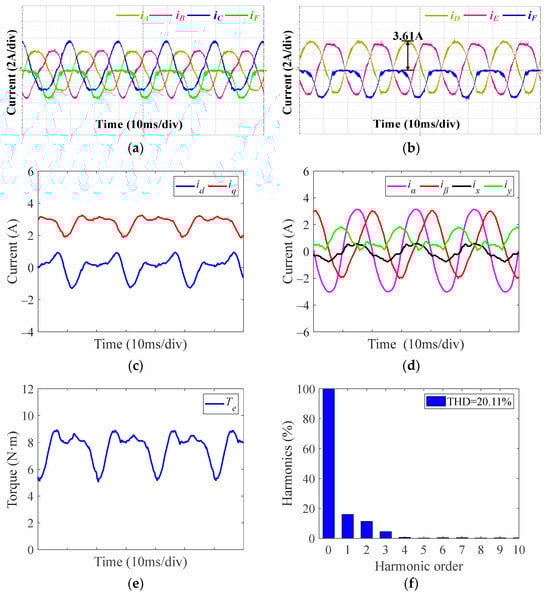 To simulate OSFs, the drive signal of the phase F upper IGBT in the program is forced to the low level. By comparing (6), (9), (10), (13), and (14), it can be found that both torque ripple and copper loss increase significantly under a single OSF and FTC operations. Therefore, to protect the experimental platform, derated experiments are conducted under these operations. Specifically, the speed is set to 1000 r/min, and the load is limited to 7.5 N·m. Figure 11 presents experimental results under the upper IGBT OSF of phase F without FTC. In Figure 11a,b, phase current waveforms illustrate that during the conduction time of the upper IGBT, the fault current of phase F is forced to a value that is infinitely close to 0. In this condition, the y-axis current and β-axis currents exhibit the same amplitude with opposite phases. In αβ subspace, the amplitude of the α-axis current surpasses that of the β-axis current, resulting in noticeable second harmonic ripples in the dq-axis currents shown in Figure 11c,d. Conversely, during the conduction time of the lower IGBT, the fault current resembles normal operation, generating negative currents. Figure 11e and f present the torque waveforms and FFT results, illustrating that the upper IGBT OSF of phase F introduces the fundamental frequency torque ripple alongside the second and third harmonic torque ripples due to the absence of one switch.